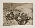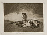 The Disasters of War (Spanish: Los desastres de la guerra) is a series of 82[a 1] prints created between 1810 and 1820 by the Spanish painter and printmaker Francisco Goya (1746–1828). Although Goya did not make known his intention when creating the plates, art historians view them as a visual protest against the violence of the 1808 Dos de Mayo Uprising, the subsequent Peninsular War of 1808–1814 and the setbacks to the liberal cause following the restoration of the Bourbon monarchy in 1814. During the conflicts between Napoleon's French Empire and Spain, Goya retained his position as first court painter to the Spanish crown and continued to produce portraits of the Spanish and French rulers.[2] Although deeply affected by the war, he kept private his thoughts on the art he produced in response to the conflict and its aftermath.[3] He was in poor health and almost deaf when, at 62, he began work on the prints. They were not published until 1863, 35 years after his death.[4] It is likely that only then was it considered politically safe to distribute a sequence of artworks criticising both the French and restored Bourbons.[5] In total over a thousand sets have been printed, though later ones are of lower quality, and most print room collections have at least some of the set.