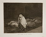 Goya does not focus on the reasons for the shortage, nor does he apportion blame to any one party. Instead, he is concerned only with its effect on the population.[32] Although the images in the group were based on the experience of Madrid, none of the scenes depict specific events, and there are no identifiable buildings to place the scenes. Goya's focus is on the darkened masses of dead and barely alive bodies, men carrying corpses of women, and bereaved children mourning for lost parents.[33] Hughes believes plate 50, Madre infeliz! (Unhappy mother!), to be the most powerful and poignant of the group. He suggests that the space between the small girl sobbing and the corpse of her mother represents "a darkness that seems to be the very essence of loss and orphanhood".[34] This group of plates was probably completed by early 1814.[35] A scarcity of materials during the famine may have accounted for the freer application of aquatint in these prints; Goya was sometimes forced to use defective plates or reuse old plates after they were burnished.[3]
