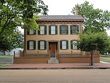 Lincoln in 1839 met Mary Todd in Springfield, Illinois, and the following year they became engaged.[42] She was the daughter of Robert Smith Todd, a wealthy lawyer and businessman in Lexington, Kentucky.[43] A wedding set for January 1, 1841 was canceled at Lincoln's request, but they reconciled and married on November 4, 1842, in the Springfield mansion of Mary's sister.[44] While anxiously preparing for the nuptials, he was asked where he was going and replied, "To hell, I suppose."[45] In 1844, the couple bought a house in Springfield near his law office. Mary kept house with the help of a relative and hired servant.[46]