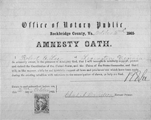 On October 2, 1865, the same day that Lee was inaugurated as president of Washington College in Lexington, Virginia, he signed his Amnesty Oath, thereby complying fully with the provision of Johnson's proclamation. Lee was not pardoned, nor was his citizenship restored.[132]