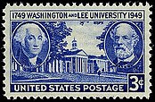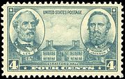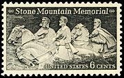 Washington and Lee University in Lexington, Virginia was commemorated on its 200th anniversary on November 23, 1948, with a 3-cent postage stamp. The central design is a view of the university, flanked by portraits of generals George Washington and Robert E. Lee.[151] Lee was again commemorated on a commemorative stamp in 1970, along with Jefferson Davis and Thomas J. "Stonewall" Jackson, depicted on horseback on the 6-cent Stone Mountain Memorial commemorative issue, modeled after the actual Stone Mountain Memorial carving in Georgia. The stamp was issued on September 19, 1970, in conjunction with the dedication of the Stone Mountain Confederate Memorial in Georgia on May 9, 1970. The design of the stamp replicates the memorial, the largest high relief sculpture in the world. It is carved on the side of Stone Mountain 400 feet above the ground.[152]