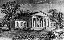 Arlington House, The Robert E. Lee Memorial, also known as the Custis–Lee Mansion,[162][163] is a Greek revival mansion in Arlington, Virginia, that was once Lee's home. It overlooks the Potomac River and the National Mall in Washington, D.C. During the Civil War, the grounds of the mansion were selected as the site of Arlington National Cemetery, in part to ensure that Lee would never again be able to return to his home. The United States designated the mansion as a National Memorial to Lee in 1955, a mark of widespread respect for him in both the North and South.[164]
