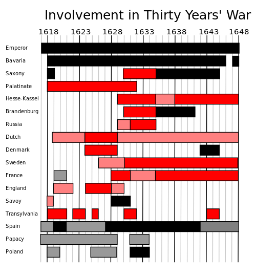 The war can be divided into four major phases: The Bohemian Revolt, the Danish intervention, the Swedish intervention, and the French intervention.