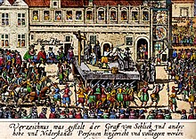 A contemporary woodcut depicts the Third Defenestration of Prague (1618), which marked the beginning of the Bohemian Revolt, and therefore of the first phase of the Thirty Years' War.