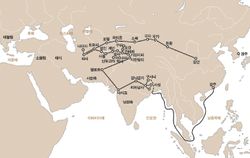 혜초의 여정. 이미 그가 인도를 방문하던 시기엔 인도의 불교는 점점 쇠하고 힌두교가 극성하고 있어 그가 안타까워 했다고 한다.