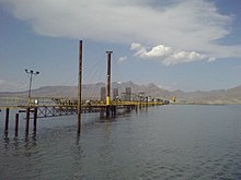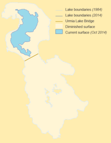 The lake is divided into north and south, separated by the Urmia Lake Bridge and its associated causeway, which was completed in 2008. The bridge provides only a 1.5-kilometre (0.93 mi) gap in the embankment, allowing little exchange of water between the two sections. Due to drought and increased demands for agricultural water in the lake's basin, the salinity of the lake has risen to more than 300 g/l during recent years, and large areas of the lake bed have been desiccated.[18]