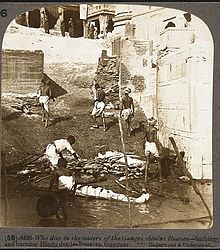 Preparations for cremations on the banks of the Ganges in Varanasi, 1903. The dead are being bathed, wrapped in cloth and covered with wood. The photograph has caption, "Who dies in the waters of the Ganges obtains heaven."