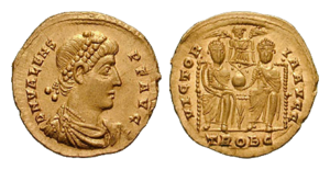 Solidus minted by Valens in c. 376. On reverse, Valens and his brother Valentinian I hold together the orb, a symbol of power.