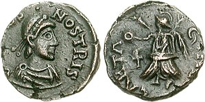 In the 470s, the Romans abandoned their policy of war against the Vandals. The Western general Ricimer reached a treaty with them,[63] and in 476 Genseric was able to conclude a "perpetual peace" with Constantinople. Relations between the two states assumed a veneer of normality.[72] From 477 onwards, the Vandals produced their own coinage, restricted to bronze and silver low-denomination coins. The high-denomination imperial money was retained, demonstrating in the words of Merrills "reluctance to usurp the imperial prerogative".[73]