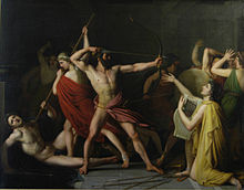 Towards the end of the poem, Odysseus forms "a clever plan to slay the suitors which involves a contest to string [his] mighty bow and shoot an arrow through a line of ax handles. The plan has been carefully formulated to allow Odysseus to catch the suitors off guard and to provide the element of surprise he needs to overpower the suitors against such great odds."[14] Odysseus' cunning enables him to overpower and defeat his opponents, even when they are physically superior to him.[11][14] This mirrors an earlier episode in the poem, where Odysseus defeats the captor Cyclops by disguising himself, then blinding him while unable to defend himself.[15]