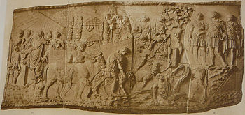 Panel from Trajan's Column depicting the lustral procession of the suovetaurilia victims under military standards
