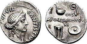 Denarius issued under Augustus, with a bust of Venus on the obverse, and ritual implements on the reverse: clockwise from top right, the augur's staff (lituus), libation bowl (patera), tripod, and ladle (simpulum)