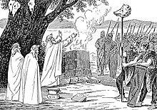 There were also holy places with no buildings, where the deity was believed to manifest in nature itself; such locations were characterised by the combined presence of trees and springs, according to the description of one such sites in Szczecin by Otto of Bamberg. A shrine of the same type in Kobarid, contemporary Slovenia, was stamped out in a "crusade" as recently as 1331.[36] Usually, common people were not allowed into the presence of the images of their gods, the sight of which was a privilege of the priests. Many of these images were seen and described only in the moment of their violent destruction at the hands of the Christian missionaries.[4] The priests (volkhvs), who kept the temples and led rituals and festivals, enjoyed a great degree of prestige; they received tributes and shares of military booties by the kins' chiefs.[17]