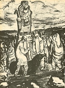 The Slavs perceived the world as enlivened by a variety of spirits, which they represented as persons and worshipped. These spirits included those of waters (mavka and rusalka), forests (lisovyk), fields (polyovyk), those of households (domovoy), those of illnesses, luck and human ancestors.[21] For instance, Leshy is an important woodland spirit, believed to distribute food assigning preys to hunters, later regarded as a god of flocks and herds, and still worshipped in this function in early twentieth-century Russia. Many gods were regarded by kins (rod or pleme) as their ancestors, and the idea of ancestrality was so important that Slavic religion may be epitomised as a "manism" (i.e. worship of ancestors), though the Slavs did not keep genealogical records.[17] The Slavs also worshipped star-gods, including the moon (Russian: Mesyats) and the sun (Solntse), the former regarded as male and the latter as female. The moon-god was particularly important, regarded as the dispenser of abundance and health, worshipped through round dances, and in some traditions considered the progenitor of mankind. The belief in the moon-god was still very much alive in the nineteenth century, and peasants in the Ukrainian Carpathians openly affirm that the moon is their god.[17]