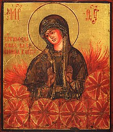 The Fiery Chariot of the Word—19th-century Russian icon of the Theotokos as Ognyena Maria ("Fiery Mary"), fire goddess sister of Perun, and a glaring example of Slavic religious themes in Christianised fashion.[45] Belief in a mother goddess as receptacle of life, Mat Syra Zemlya ("Damp Mother Earth"), was preserved in Russian folk religion up to the 20th century, often disguised as the Virgin Mary of Christianity.[46] The fiery "six-petaled roses" that umbego the Ognyena are one of the variants of the whirling symbol of the supreme God (Rod).[18]