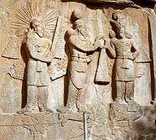 Ahura Mazda (on the right, with high crown) presents Ardashir I (left) with the ring of kingship. (Naqsh-e Rustam, 3rd century CE)