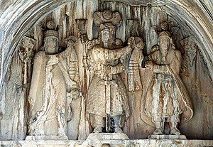 Taq-e Bostan high-relief of the investiture of Khosrow II (r. 590 to 628). The king (center) receives the ring of kingship from Mithra (right). On the left, apparently sanctifying the investiture, stands a female figure generally assumed to be Anahita.