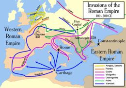 In the late 4th century, the rise of the Huns forced many of the Goths and Alans to join them, while others moved westwards and eventually moved into Roman territory in the Balkans. Ostrogoths and Greuthungi, perhaps the same people, are believed to have been among the first Goths who were subdued by the Huns.[25] Many Greuthungi entered the Roman Empire in 376 with Saphrax and Alatheus, and many of these Goths probably subsequently joined Alaric, contributing to the formation of the Visigothic kingdom.[26] As discussed above a group of Ostrogoths and Greuthungi were apparently also settled in Phrygia in the 380s by the Romans. Otherwise, historical records only begin to mention the name of the Ostrogoths as the Gothic political entity which formed in the Balkans in the 5th century.
