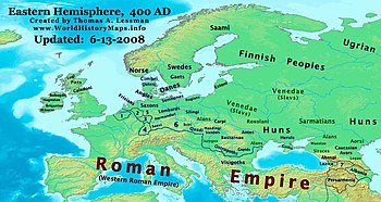 Map of the Western and Eastern Roman empire in the 5th century AD, identifying the location of the Venedae (Veneti) in central and eastern Europe.