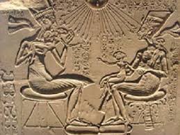 A "house altars" depicting Akhenaten, Nefertiti and three of their daughters; limestone; New Kingdom, Amarna period, 18th dynasty; c. 1350 BC. Collection: Ägyptisches Museum Berlin, Inv. 14145 (source : Nefertiti, Wikipedia)