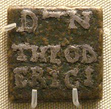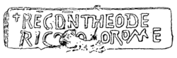 Brick with the emblem of Theodoric, found in the Temple of Vesta, Rome. It reads "+REG(nante) D(omino) N(ostro) THEODERICO [b]O[n]O ROM(a)E", which translates as With our master Theodoric the Good reigning in Rome [this brick was made].