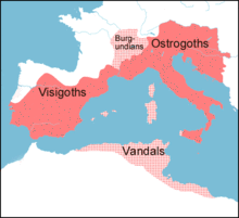 Theodoric extended his hegemony over the Burgundian, Visigothics royals, and Vandal kingdoms through marriage alliances. He had married the sister of the mighty Frankish king, Clovis—likely in recognition of Frankish power.[35] He sent a substantial dowry accompanied by a guard of 5,000 troops with his sister Amalafrida when she married the king of the Vandals and Alans, Thrasamund.[36] In 504–505, Theodoric extended his realms in the Balkans by defeating the Gepids, acquiring the province of Pannonia.[31] Theodoric became regent for the infant Visigothic king, his grandson Amalaric, following the defeat of Alaric II by the Franks under Clovis in 507. The Franks were able to wrest control of Aquitaine from the Visigoths, but otherwise Theodoric was able to defeat their incursions.[37][38]