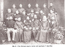 Caucasus Greeks were often multilingual, able to speak, read, and write Greek and Russian and speak Eastern Anatolian Turkish, and sometimes also basic Georgian and Armenian.[42] Although their native language was Greek, generally only the most highly educated - such as scholars, lawyers, members of the Orthodox clergy educated in Russian universities, and other community leaders claiming noble or royal lineage extending back to the Empire of Trebizond - had more than an intermediate-level knowledge of formal Demotic Greek and the more classicizing Katharevousa of the late Byzantine period.[43] The majority were restricted to their own variant of Pontic Greek, which had a somewhat larger admixture of Turkish, Georgian, Russian, and Armenian vocabulary than the colloquial form of Greek used in Pontus proper.[44] However, the Caucasus Greeks had had to become fluent Russian speakers, as a result of the schooling and education policies implemented by the Russian Imperial government, although at home and amongst themselves they continued to favour Greek.[45] But Caucasus Greeks were still often conflated or confused with Russians in Kars Oblast because of their use of Russian and worship alongside Russians in the same Orthodox churches as well as their generally Russianized and pro-Russian empire outlook. In fact, one quite popular but stereotyped way local 'Turks' might differentiate Caucasus Greeks from other Pontic Greeks was by stating that the former were "Greeks who had taken the Borshch [soup] from the Russians"![46]