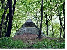 One of the most interesting megalithic complexes – group of three dolmens - stands in a row on a hill above Zhane River on the Black Sea coast in the Krasnodar area near Gelendzhik, Russia. In this area there is a great concentration of all types of megalithic sites including settlements and dolmen cemeteries. Large stone mounds surrounded the two monuments.