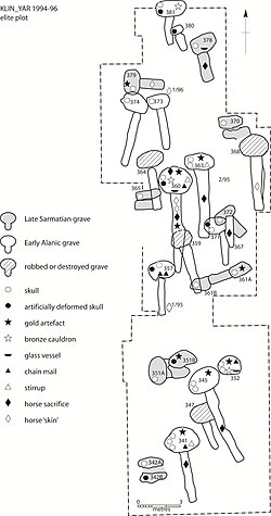 Settlement pottery of the Alanic period has been found on the southern and northern slopes, and on top of the rock. Alanic graves of the 5th – 7th/early 8th centuries AD are located on the southern slope (cemetery III), with further graves of the 7th/early 8th centuries AD on the northern slope (cemetery IV). The standard grave type is a large catacomb with an entrance corridor (dromos), usually with several burials in the chamber. The burial ritual is basically the same as in the Sarmatian period, but with a wider range of grave-goods and with more elaborate ritual (horse sacrifice, pottery depositions and traces of fire in the dromoi). Finds of special interest include a Central Asian type of sword with P-shaped scabbard fittings (Grave 360), an Iranian glass bowl (Grave 360), and gold coins of the Byzantine emperors Tiberius Mauritius (Maurice (emperor)) and Heraclius (Graves 341 and 363).[5]