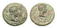 Coin of Rhoemetalces I (r. 11 BC–12 AD). The obverse shows Rhoemetalces and his wife Pythodoris, the reverse Emperor Augustus.
