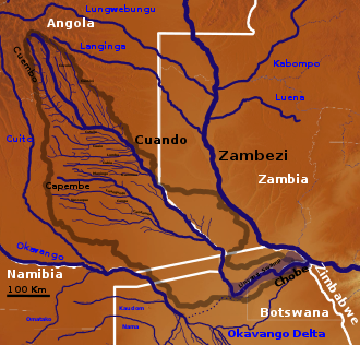 The Cuando River is a river in south-central Africa flowing through Angola and Namibia's Caprivi Strip and into the Linyanti Swamp on the northern border of Botswana.[2] Below the swamp, the river is called the Linyanti River and, farther east, the Chobe River,[3] before it flows into the Zambezi River.