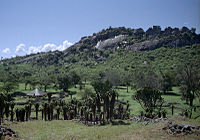 Overview of Great Zimbabwe. The large walled construction is the Great Enclosure. Some remains of the valley complex can be seen in front of it.