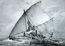 An Austronesian outrigger canoe; Malagasy vahoaka "people" is from Proto-Malayo-Polynesian *va-waka "people of the canoe". The Vahoaka Ntaolo, the first Austronesian ancestors of the Malagasy, probably used similar canoes to reach the great island from the Sunda Islands