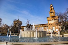 The original construction was ordered by local lord Galeazzo II Visconti in 1358–c. 1370;[1] this castle was known as Castello di Porta Giova (or Porta Zubia), from the name of a gate in walls located nearby.[2] It was built in the same area of the ancient roman fortification of Castrum Portae Jovis, which served as castra pretoria when the city was the capital of the roman empire. The successors of Galeazzo, Gian Galeazzo, Giovanni Maria and Filippo Maria Visconti enlarged it, until it became a square-plan castle with 200 m-long sides, four towers at the corners and up to 7-metre-thick (23 ft) walls.[2] The castle was the main residence in the city of its Visconti lords, and was destroyed by the short-lived Golden Ambrosian Republic which ousted them in 1447.