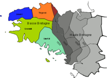 A French map of the traditional regions of Brittany in Ancien Régime France. The earlier state of Domnonia or Domnonée that united Brittany comprised the counties along the north coast