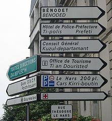 Breton-speaking people may pronounce the word Breizh in two different ways, according to their region of origin. Breton can be divided into two main dialects: the KLT (Kerne-Leon-Tregor) and the dialect of Vannes. KLT speakers pronounce it [brɛjs] and would write it Breiz, while the Vannetais speakers pronounce it [brɛχ] and would write it Breih. The official spelling is a compromise between both variants, with a z and an h together. In 1941, efforts to unify the dialects led to the creation of the so-called Breton zh, a standard which has never been widely accepted.[1] On its side, Gallo has never had a widely accepted writing system and several ones coexist. For instance, the name of the region in that language can be written Bertaèyn in ELG script, or Bertègn in MOGA, and a couple of other scripts also exist.[15]