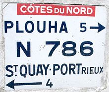 An old road sign on the Route Nationale 786 in Tréveneuc