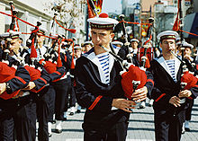 Since the early 1970s, Brittany has experienced a tremendous revival of its folk music. Numerous festivals were created, along with smaller fest-noz (popular feasts). The bagadoù, bands composed of bagpipes, bombards and drums (including snare), are also a modern creation, inspired by the Scottish pipe bands. The Lann-Bihoué bagad, one of the most well-known, belongs to the French Navy. It is the only one that does not take part to the annual bagadoù competitions. Celtic harp is also common, as are vocals and dances. The Kan ha diskan is the most common type of singing. The performers sing calls and responses while dancing. Breton dances usually imply circles, chains or couples and they are different in every region. The oldest dances seem to be the passepied and the gavotte, and the newest ones derive from the quadrille and French Renaissance dances.