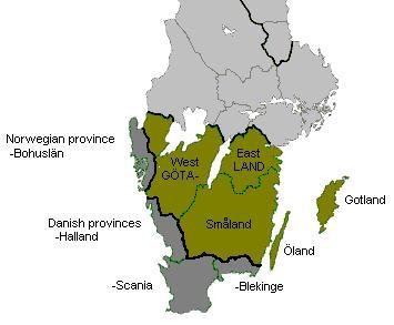 Map of Götaland, the areas of the Geats, which politically merged with the Swedes to form Sweden. Note that Värmland, north of Västergötland, also was a part of Götaland originally, while the large island of Gotland was not. Expansions in dark gray outside the border, including Gotland. Gotaland Origin (source : Wikipedia)