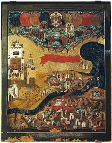 The 16th century Vision of Tarasius icon depicts Novgorod with the Sofia side to the left and the Commercial side to the right. The inhabitants of the city are shown doing their day-to-day work while being guarded by the angels