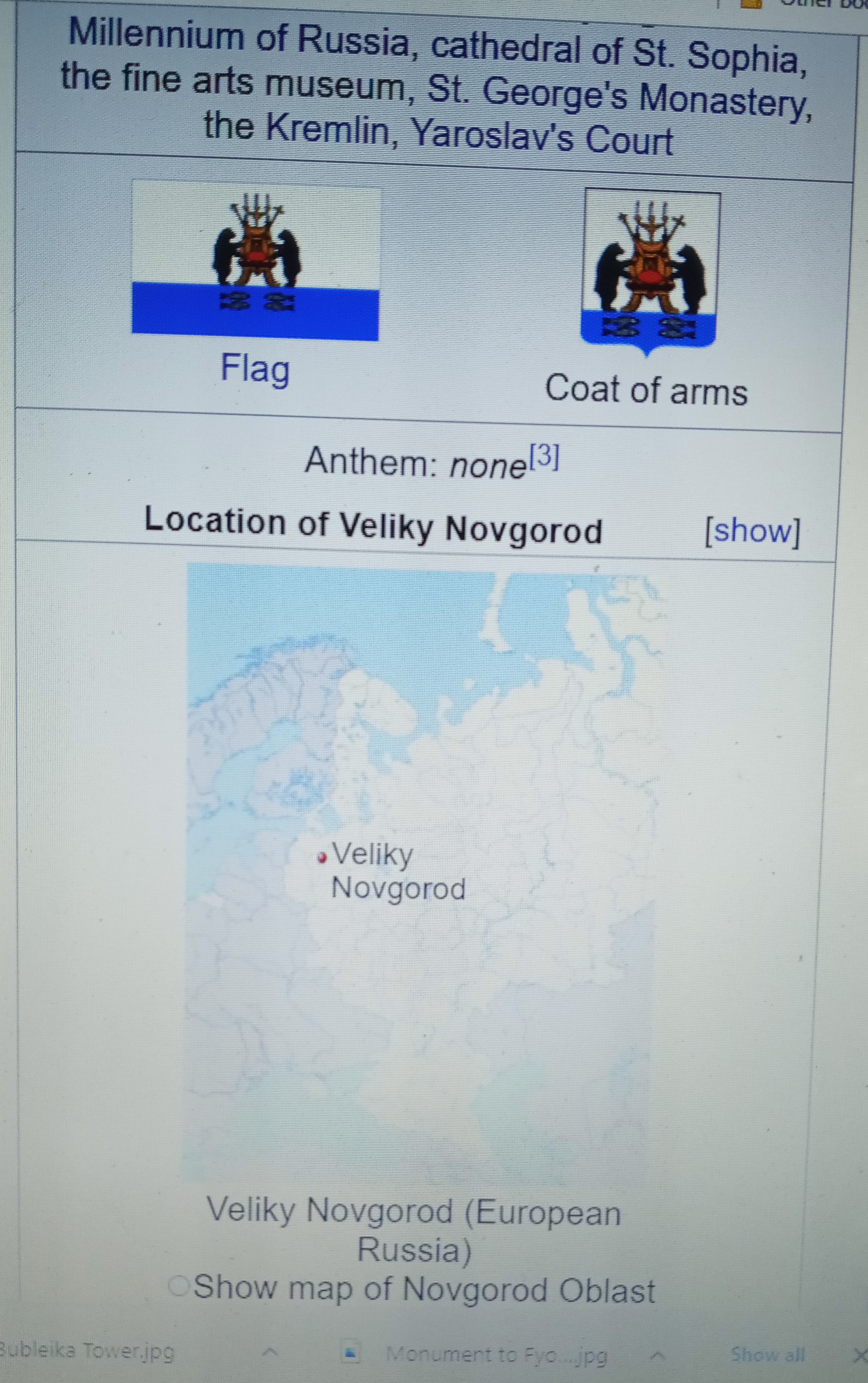 The city is known for the variety and age of its medieval monuments. The foremost among these is theSt. Sophia Cathedral, built between 1045 and 1050 under the patronage of Vladimir Yaroslavich, the son ofYaroslav the Wise; Vladimir and his mother,Anna Porphyrogenita, are buried in the cathedral.[39]It is one of the best preserved churches from the 11th century. It is also probably the oldest structure still in use in Russia and the first one to represent original features of Russian architecture (austere stone walls, five helmet-like domes). Its frescoes were painted in the 12th century originally on the orders of Bishop Nikita (died 1108) (the "porches" or side chapels were painted in 1144 underArchbishop Nifont) and renovated several times over the centuries, most recently in the nineteenth century.[40]The cathedral features famous bronze gates, which now hang in the west entrance, allegedly made inMagdeburgin 1156 (other sources see them originating fromPłockinPoland) and reportedly snatched by Novgorodians from the Swedish town ofSigtunain 1187. More recent scholarship has determined that the gates were most likely purchased in the mid-15th century, apparently at the behest of ArchbishopEuthymius II(1429–1458), a lover of Western art and architectural styles.[41]