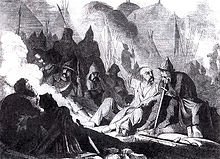 Virtually nothing is known about Sviatoslav's childhood and youth, which he spent reigning inNovgorod. Sviatoslav's father,Igor, was killed by theDrevliansaround 945, and his mother,Olga, ruled asregentinKievuntil Sviatoslav reached maturity (ca. 963).[11]Sviatoslav was tutored by aVarangiannamed Asmud.[12]The tradition of employing Varangian tutors for the sons of ruling princes survived well into the 11th century. Sviatoslav appears to have had little patience for administration. His life was spent with hisdruzhina(roughly, "company") in permanent warfare against neighboring states. According to the Primary Chronicle, he carried neither wagons nor kettles on his expeditions, and he boiled no meat, rather cutting off small strips of horseflesh, game, or beef to eat after roasting it on the coals. Nor did he have a tent, rather spreading out a horse-blanket under him and setting his saddle under his head, and all his retinue did likewise.[13]