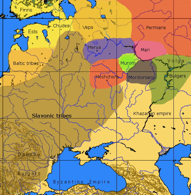 볼가 불가리아 좌측의 Mari, Merya, Muroma 핀족 주거 지역 지도 (자료 : 위키피디아)