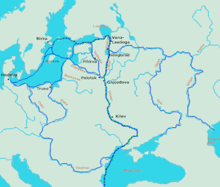 The route began in Scandinavian trading centers such as Birka, Hedeby, and Gotland, the eastern route crossed the Baltic Sea, entered the Gulf of Finland, and followed the Neva River into Lake Ladoga. Then it followed the Volkhov River upstream past the towns of Staraya Ladoga and Velikiy Novgorod, crossed Lake Ilmen, and continued up the Lovat River, the Kunya River and possibly the Seryozha River [ru]. From there, a portage led to the Toropa River [ru] and downstream to the Western Dvina River. From the Western Dvina, the ships went upstream along the Kasplya River and were portaged again to the Katynka River (near Katyn), a tributary of the Dnieper. It seems probable that once the route was established, the goods were unloaded onto land transport to cross the portage and reloaded onto other waiting ships on the Dnieper. Along the Dnieper, the route crossed several major rapids and passed through Kiev. After entering the Black Sea, it followed its west coast to Constantinople.[1]