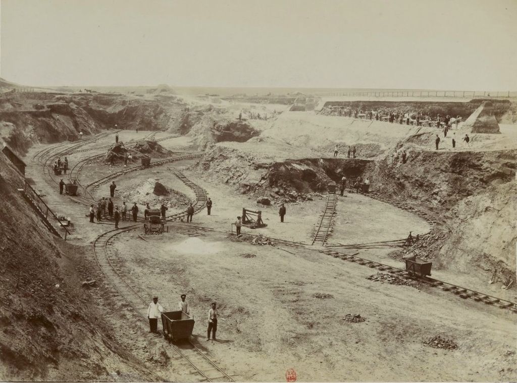 In 1880, with 5 millionfrancsofcapital, Pol founded the "French Society of Kryvyi Rih Ores". In 1882 16.4 thousand tons of ore were extracted from surface mines on the outskirts of town by 150 workers. The first underground mine of the basin began operations in 1886.[21]In1892, whenHdantsivkaironworkswas started, ore began to be processed locally, spawning new metalurgical enterprises spurred by substantial western, and in particular Belgian,[22]investment.. At the same time Kryvyi Rih ore began to feed the German metalurgical industry inSilesia. In 1902, the Catherine Railroad linked Kryvyi Rih to the coal mines of the Donbas.[23]