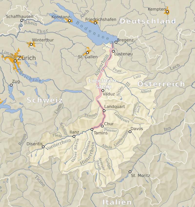 Map of location of Zurich and St Gallen canton in Switzerland around Alpine Rhine river
