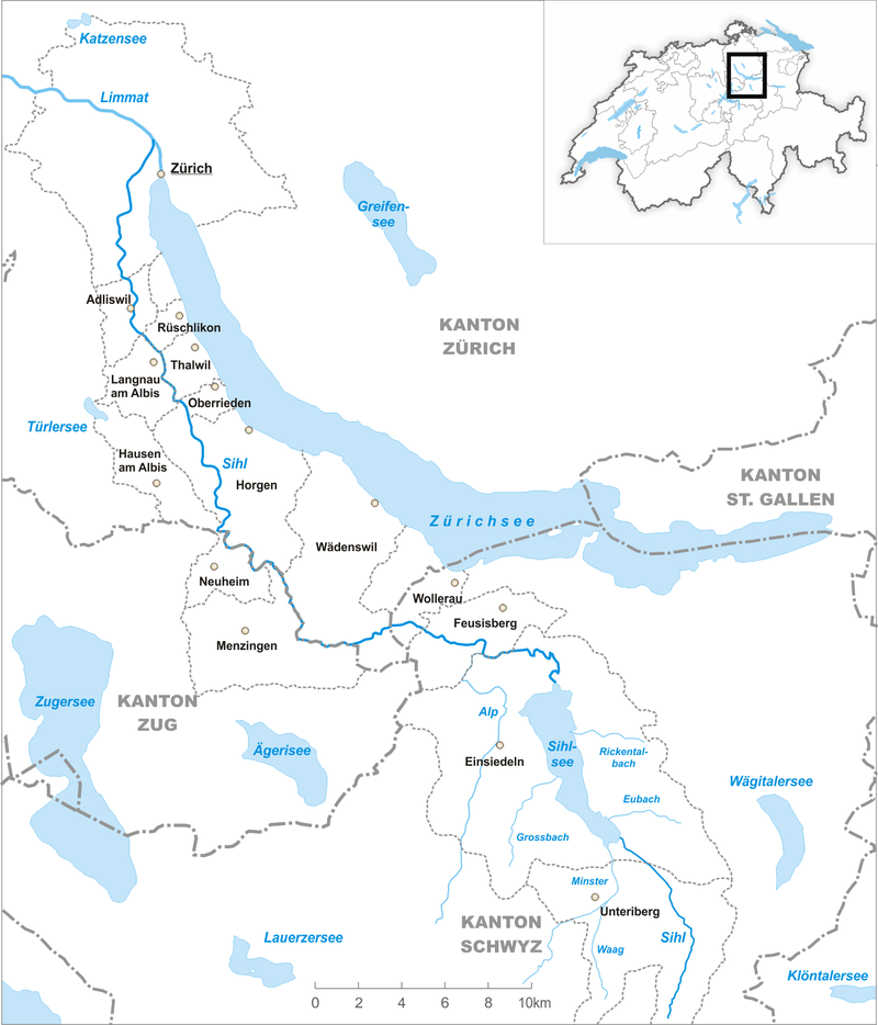The river flows through, or along the border of, the cantons of Schwyz, Zürich and Zug. The main settlements of the Sihl Valley are all in the canton of Zürich, and include the towns of Langnau am Albis and Adliswil, along with a south-western segment of the city of Zürich. Above Langnau am Albis, some 13 km (8.1 mi) from the confluence with the Limmat, there are no major settlements alongside the river, and only a few small villages. Whilst the town of Einsiedeln is situated close to the Sihlsee, it is actually in the valley of a tributary river, the Alp.[1]