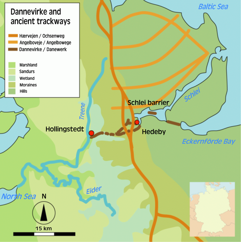 (번역) 유럽대륙으로의 바이킹의 팽창은 제약되었다. 바이킹은 남쪽의 힘센 문화에 국경을 접했는데, 지금 독일 북쪽에 위치한 Old Saxony를 점령했던 Saxons족이었다. 삭슨족은 용맹하고 강한 부족으로 자주 바이킹과 싸우게 되었다. 삭슨족의 침입을 물리치고 자신들의 존재를 안정시키기 위해, Danes족은 Hedeby 근처에 Danevirke라는 거대한 방어성벽을 건설했다.