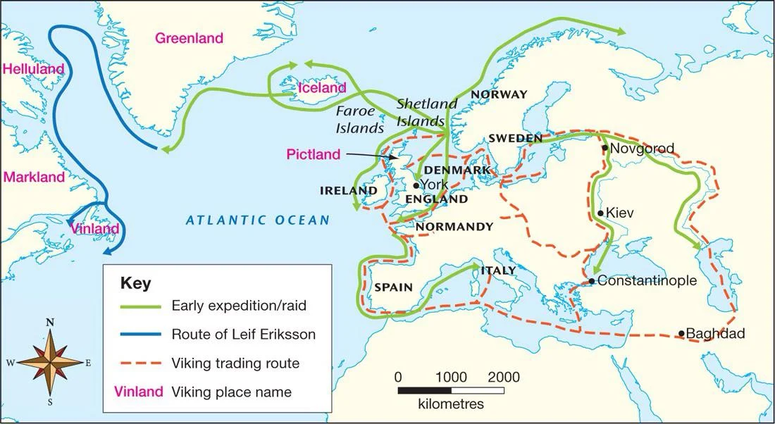바이킹의 영토 및 활동 지역 (자료 : 위키피디아)