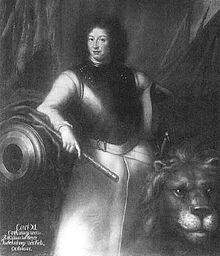 An entire staff of Swedish politicians, artists, poets and scholars were engaged in creating an image of the king as an instrument of God and a personification of the apocalyptic "Lion of the North", a form of symbolic imagery first introduced for Gustav II Adolf. The propaganda was not only aimed at convincing the Swedish population of the king's divinely ordained power, but was also part of a campaign to present Sweden to the world as an imperial power of considerable wealth and military glory.[33] Many works of art from the era show Charles XI as a victorious warrior in Scania and on the central panel of Jacques Foucquet’s monumental ceiling painting in the Stockholm Royal Palace, Charles XI is depicted with "the goddess of Scania" at his feet.[34]